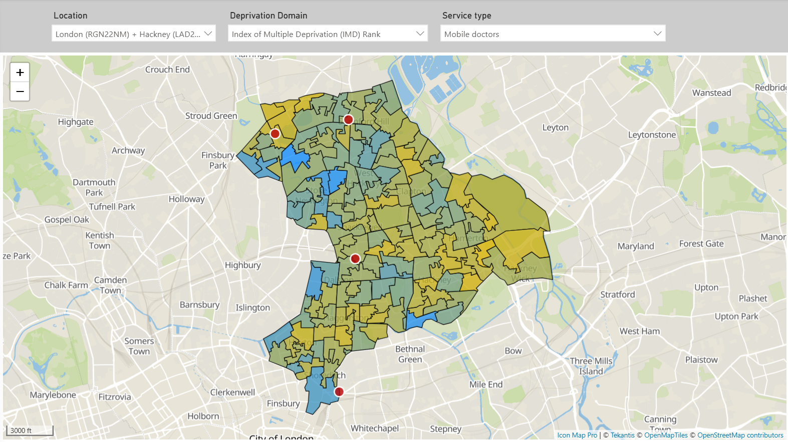 Maps help answer these questions by bringing multiple factors together, such as demand, capacity, workforce and access, into a single view. They also make trade offs easier to explain. A clear map often communicates risk and rationale more effectively than a set of charts or spreadsheets. For example, the below image shows the locations of mobile doctors and areas of deprivation within a London Borough.